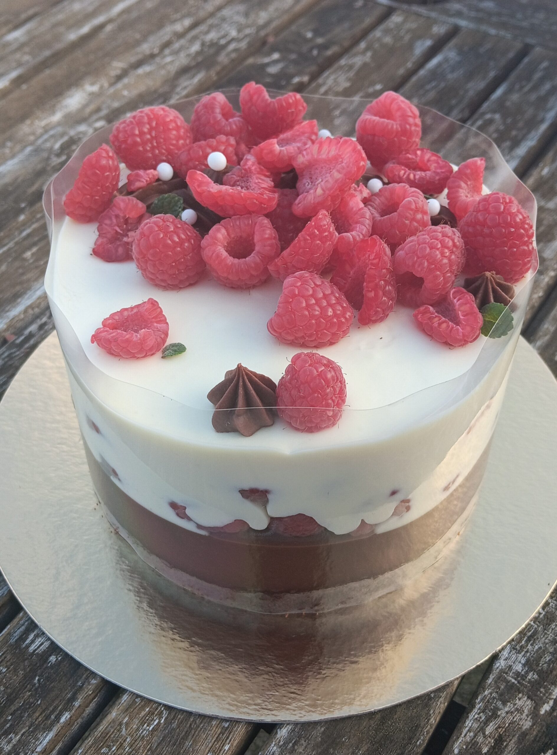 Biscuit moelleux amande, compotée de framboise et rose, mousse litchi, croustillant amande